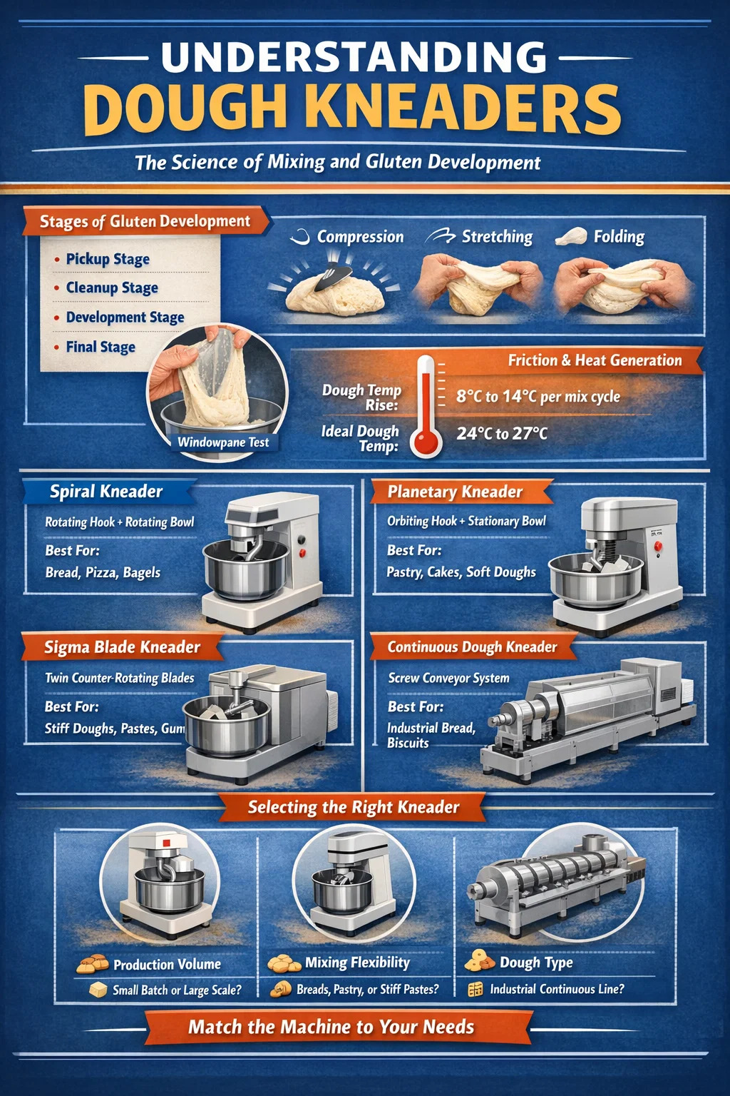 Niezależnie od tego, czy używasz małej ugniatarki spiralnej w pobliskiej piekarni, czy przemysłowej ugniatarki ciasta przetwarzającej w sposób ciągły kilka ton na godzinę, podstawowe zasady fizyki i chemii pozostają niezmienne. Zmienia się skala, geometria mieszadła i poziom kontroli procesu dostępny dla operatora.