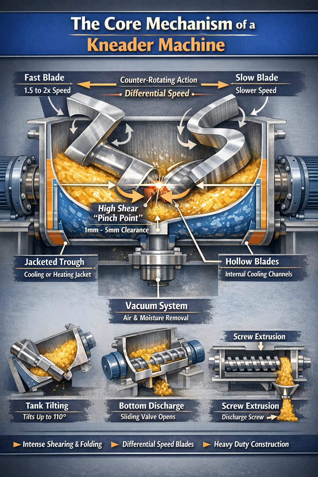 Mieszanie w maszyna do ugniatania występuje najintensywniej w „punktach uszczypnięcia”. Są to mikroskopijne szczeliny pomiędzy końcówką ostrza a wewnętrzną powierzchnią rynny mieszającej.