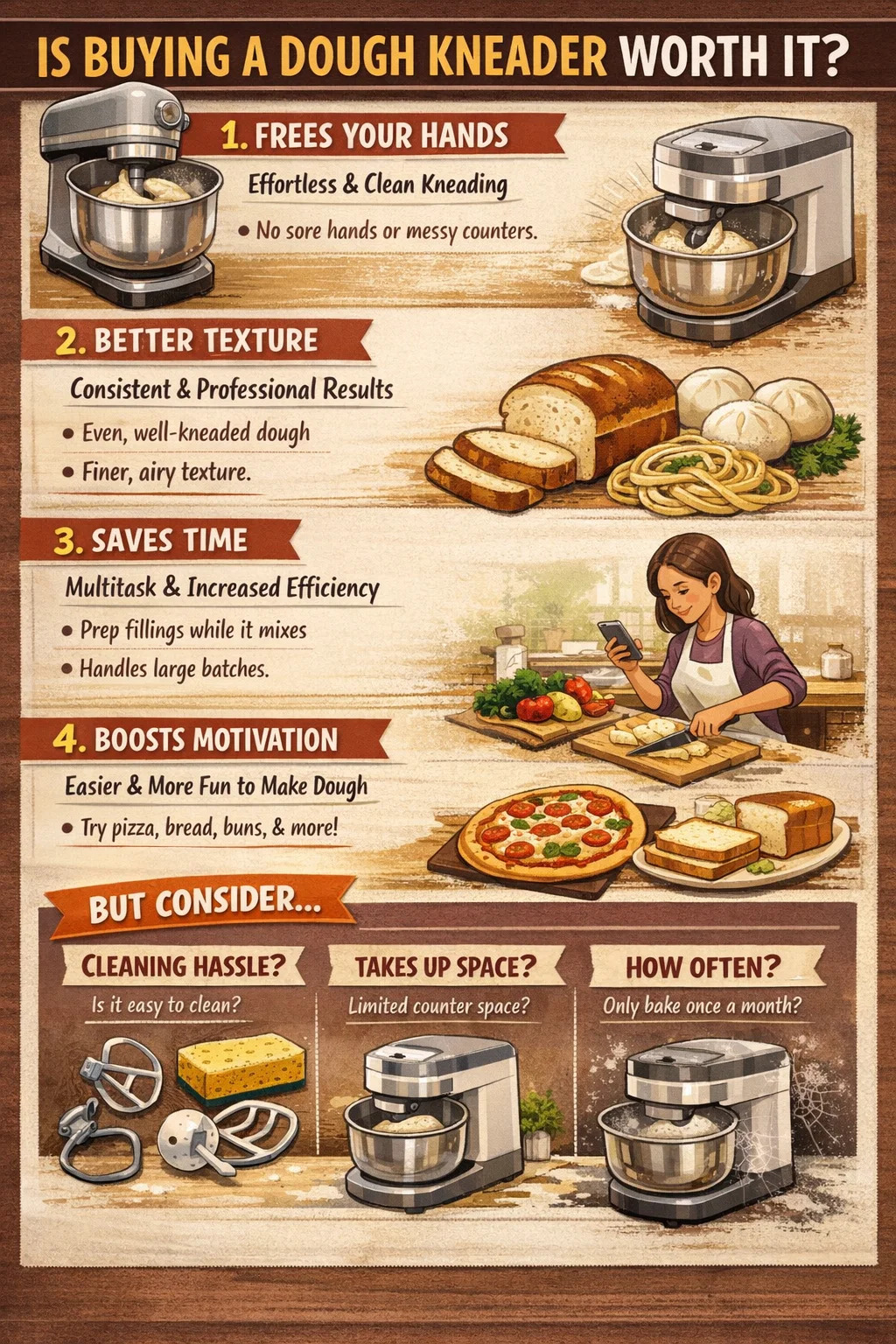 Bez wysiłku: Wyrabianie ciasta jest wymagające fizycznie, szczególnie jeśli chcesz uzyskać konsystencję „szyby okiennej” lub gumowatą. Często występują bóle rąk i pleców. W maszynie wystarczy wsypać wodę z mąką i nacisnąć przycisk.