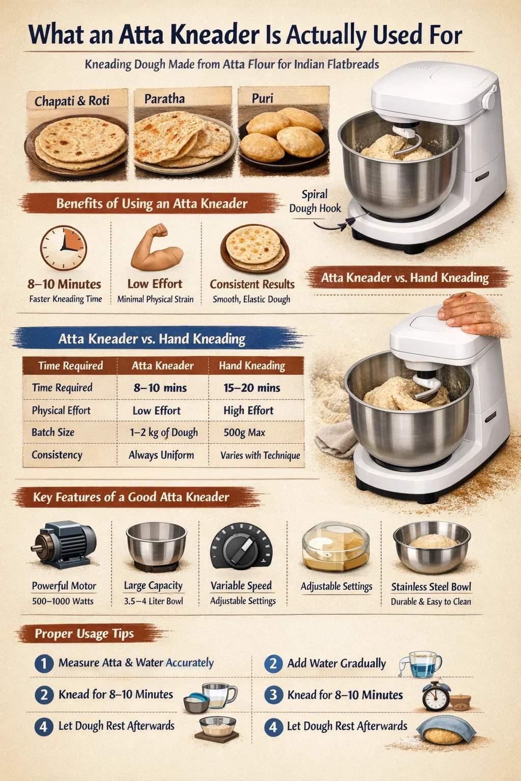 Ugniatacz atta to urządzenie kuchenne lub przystawka zaprojektowana specjalnie do mieszania i ugniatania ciasta wykonanego z mąki atta – mąki pełnoziarnistej używanej jako podstawa indyjskich podpłomyków, takich jak chapati, roti, paratha i puri. Maszyna naśladuje ruchy składania, dociskania i rozciągania charakterystyczne dla ręcznego ugniatania, rozwijając pasma glutenu w cieście, tworząc miękką, elastyczną konsystencję potrzebną do podpłomyków, które równomiernie się pęcznieją i pozostają delikatne po ugotowaniu.